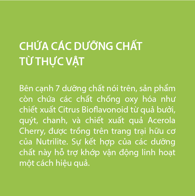 Để sản phẩm phát huy hiệu quả tối đa cho các vấn đề liên quan đến xương khớp, anh chị vui lòng tham khảo thêm các sản phẩm TP BVSK Cal Mag D và TPBVSK Nutrilite™ Advanced Triple Omega-3 của Amway.